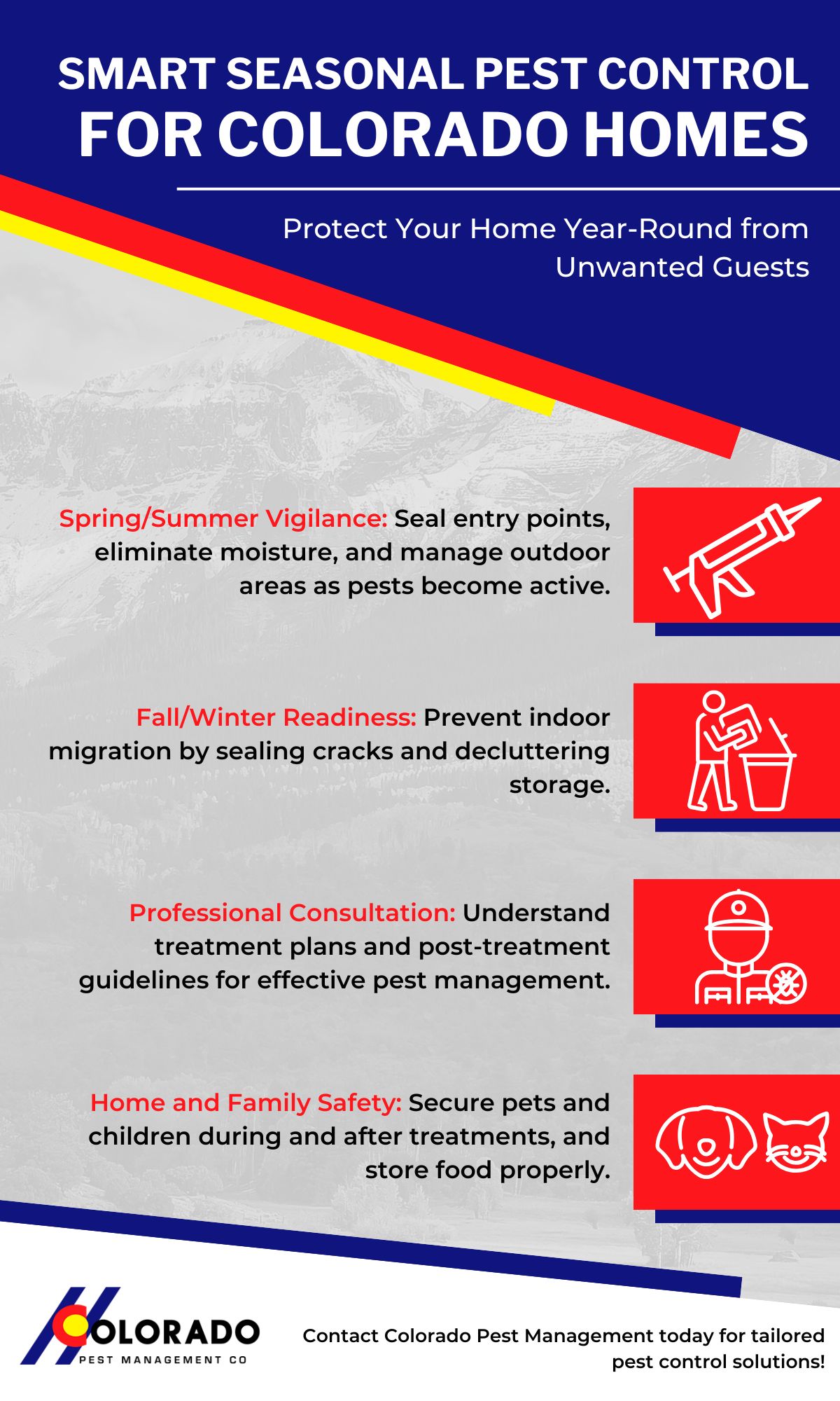 Preparing your home seasonally is a proactive step toward effective pest management. By following these tips and partnering with a trusted service like Colorado Pest Management, you can ensure your property remains a safe, comfortable, and pest-free sanctuary year-round. Learn how Colorado Pest Management can create a customized plan for your home by contacting us today for a consultation.