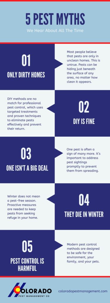 Don’t let pest myths lead you astray. If you’re dealing with pests or want to prevent future infestations, contact Colorado Pest Management. We offer customized pest control solutions to suit your needs. Schedule your consultation today and enjoy peace of mind knowing your home is protected.
